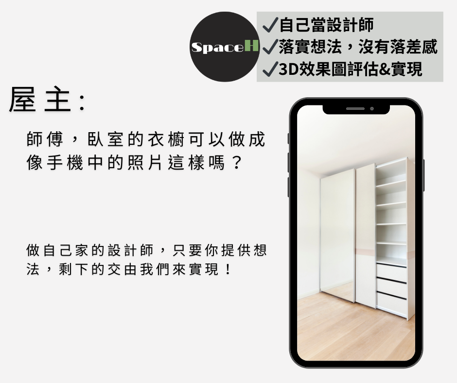 而你真的不知道要怎麼開始嗎?哦~不…你其實懂!!。你的相薄及心中已經有很多覺得不錯的櫥櫃格局了「這邊我想吊衣櫃及拉門,那邊我想做開放櫃,另一邊要做抽屜」你只是不知道這些想法放進你的客廳、廚房、工作室或臥室會變得如何?會不會很不搭?動線好不好?很多疑問也殊難想像未來家的樣子。